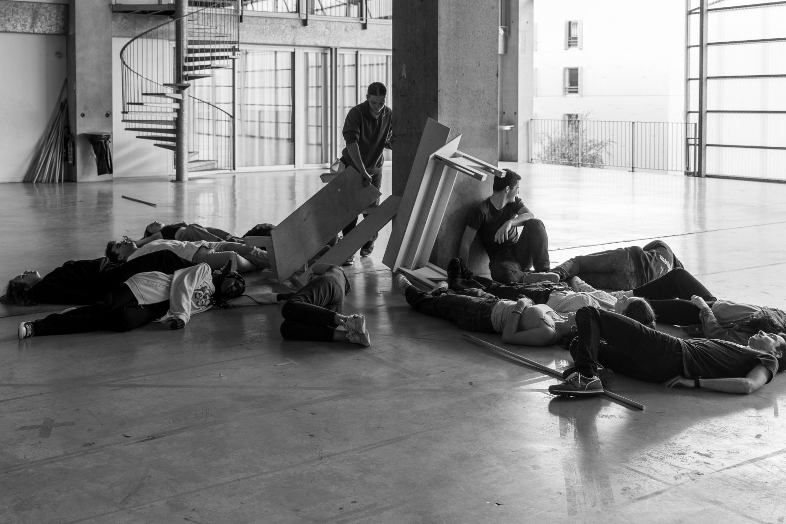 Chaque promotion pratique et performe la fonte, désormais "geste marque" de l'école : le corps passe de sa verticalité à l'horizontalité étale sur le sol, un devenir ruine en accéléré.